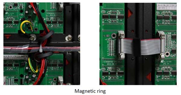 Due to signal power amplification of wiring of HUB board, interference signals are amplified synchronously; if signals are transmitted to the module, it will generate adverse effects. Receiving card plus EMC filter circuit is to filter out the interference signal.